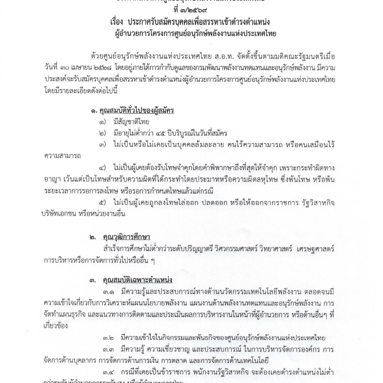 มี.ค.252026 ประกาศรับสมัครบุคคลเพื่อเข้ารับการสรรหา ตำแหน่ง ผู้อำนวยการโครงการศูนย์อนุรักษ์พลังงานแห่งประเทศไทย