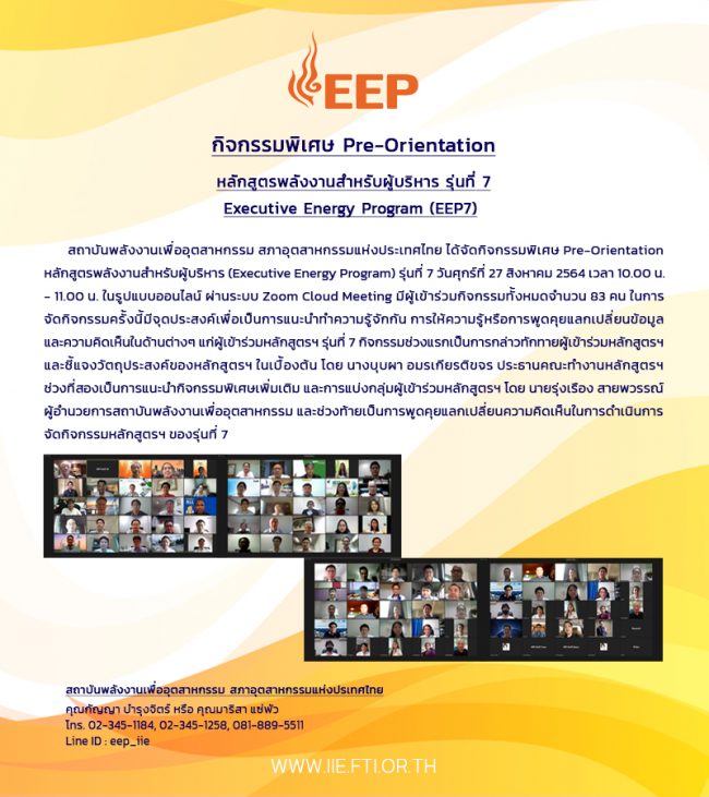 กิจกรรมพิเศษ Pre-Orientation หลักสูตรพลังงานสำหรับผู้บริหาร รุ่นที่ 7 Executive Energy Program (EEP7) ข่าวสารและกิจกรรม EEPBy iieadmin20206 กันยายน 2021https://www.youtube.com/watch?v=nXPMVkS2Bac