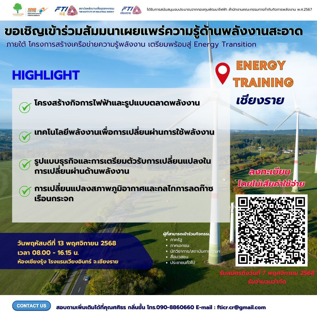 ขอเชิญชวนเข้าร่วมสัมมนาเผยแพร่ความรู้ด้านพลังงานสะอาดภายใต้โครงการสร้างเครือข่ายความรู้พลังงาน เตรียมพร้อมสู่ Energy Transition ณ ห้องเชียงรุ้ง โรงแรมเวียงอินทร์ จังหวัดเชียงราย