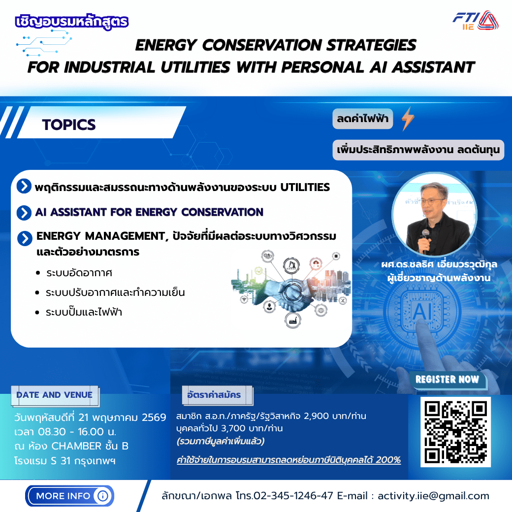 ขอเชิญเข้าร่วมอบรม Energy Conservation Strategies for Industrial Utilities with Personal AI Assistant